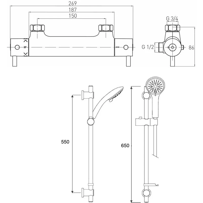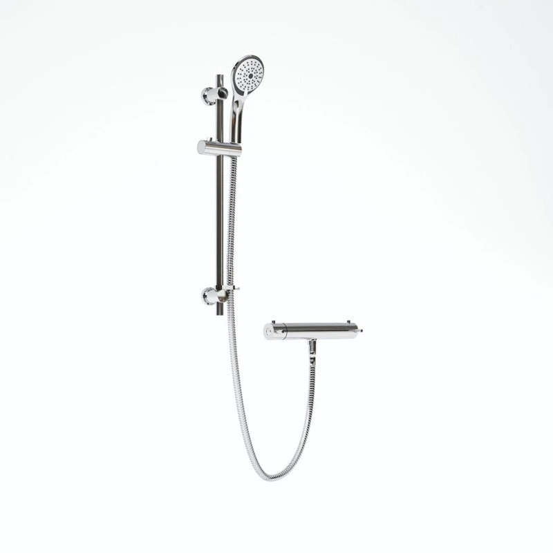 Prism Cool Touch Bar Mixer with adjustable riser rail, multi mode handset and fast fit wall fixings