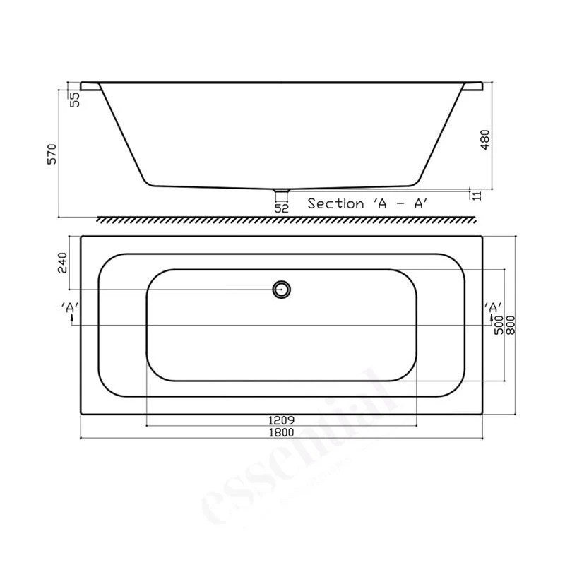 Essential Islington Rectangular Double Ended Bath, 1800x800mm, 0 Tap Holes, White