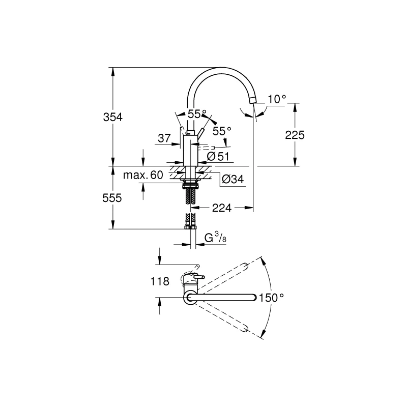 Selectable swivel area : 0° / 150°