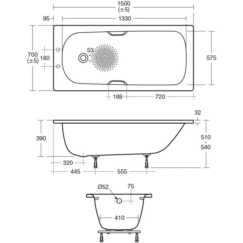 Simplicity 150 x 70cm steel bath, chrome grips, 2 tapholes