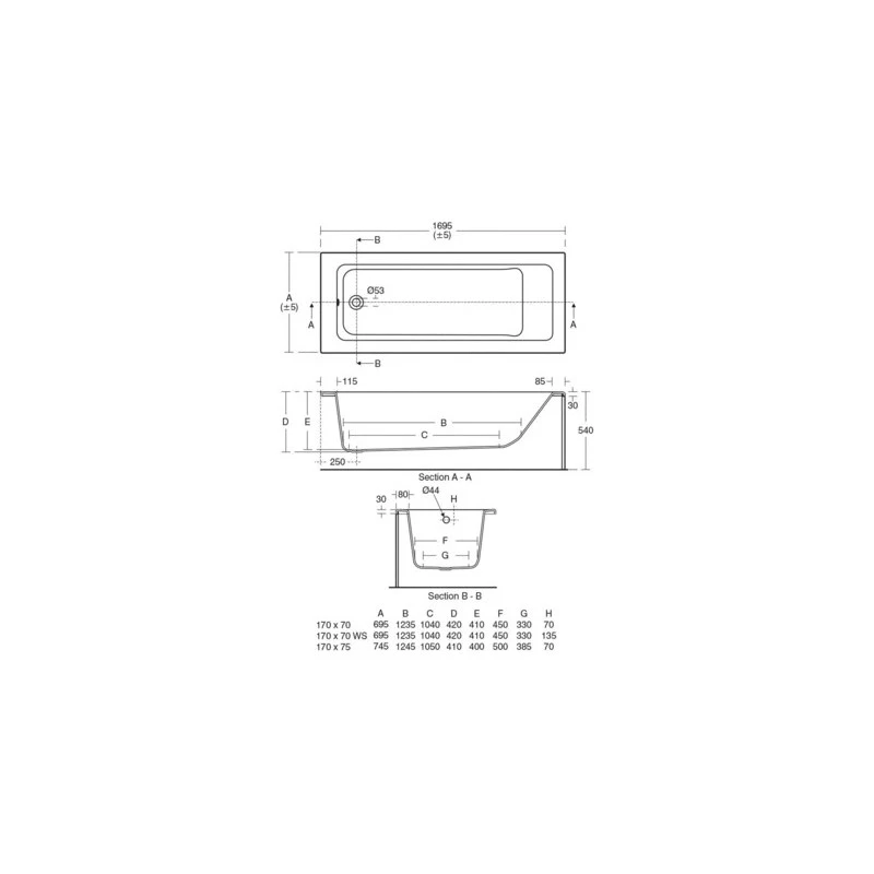 Tempo Cube 170 x 75cm rectangular water saving bath, no tapholes