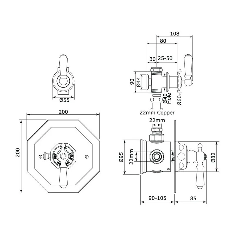 Traditional Concealed Thermostatic Shower Mixer with Remote Shut-Off and Lever Handles, Chrome