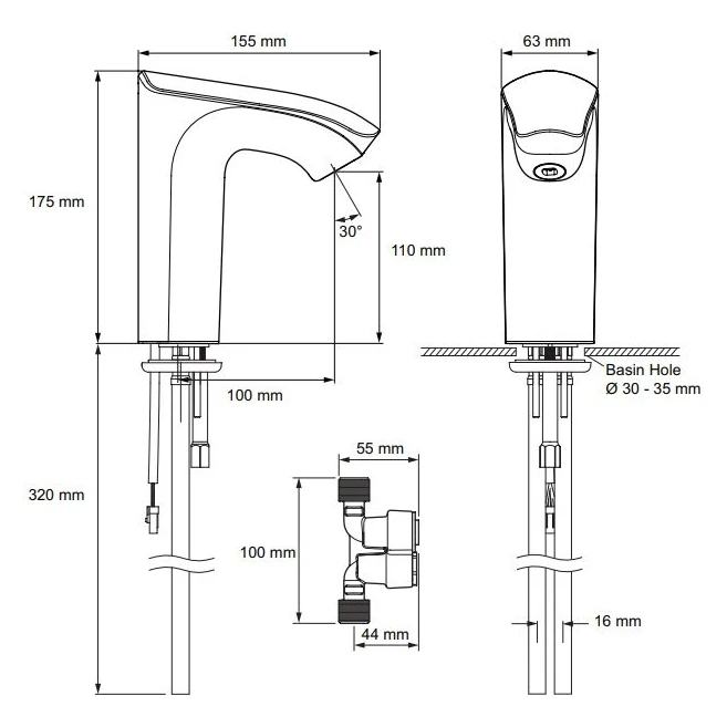 Intelligent thermostatic basin tap with non-touch flow (IR) control, smooth bore copper outlet pipe with open bore flow insert, copper tails, programmable temperatures, run time, automated blend duty flush and cold flush, thermal disinfection, integral 12 month data log and optional connection to building network systems