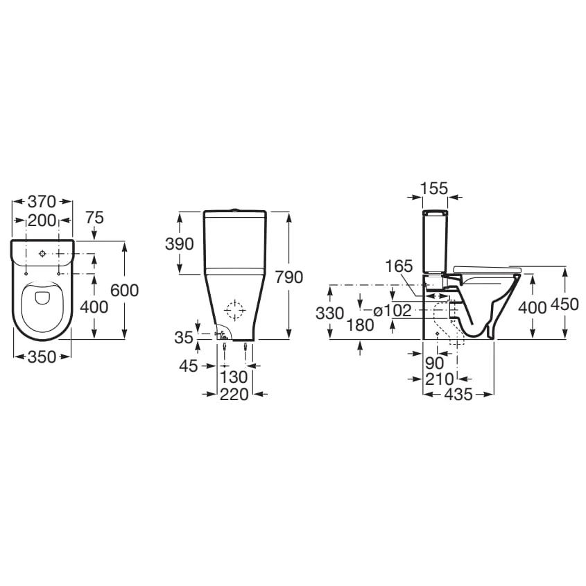 Roca The Gap Round back to wall vitreous china close coupled Rimless WC with dual outlet